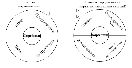 Відзначимо, що споживач не входить до складу комплексів маркетинг микс і маркетингових комунікацій. Ілюстрація показує, що на нього спрямовано вплив елементів комплексів.