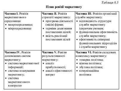 Контроль за дотриманням запланованої стратегії підприємства, його місії, цілей та завдань, — передбачає ревізію маркетингу. Завдання ревізії маркетингу — визначити, які пункти маркетингового плану не реалізуються і з яких причин; чи правильно визначено мету та завдання маркетингу і розроблено його структуру; якою мірою у стратегії маркетингового плану враховано зміни в ситуації на ринку, у навколишньому середовищі тощо.Головне завдання ревізії — розробити пропозиції, на підставі яких необхідно коригувати діючі маркетингові плани; ці пропозиції необхідно враховувати при складанні майбутніх планів.Результати ревізії маркетингу з розробленими рекомендаціями щодо вдосконалення подальшої маркетингової діяльності підприємства з урахуванням змін у маркетинговому середовищі подають вищому керівництву. Рішення щодо прийняття необхідних заходів затверджує рада директорів підприємства.Ревізію маркетингу здійснюють за певним планом. Приклад плану ревізії маркетингу, згідно з яким ревізор з маркетингу може збирати інформацію під час ревізії, наведено у табл.
