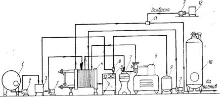 1-емкость для сырого молока; 2 - насосы; 3 - балансировочный бачок: 4-пластинчатая пастеризационно-охладительная установка; 5 - пульт управления; 6 - возвратный клапан; 7 - сепаратор-нормализатор; 8 - гомогенизатор; 9 - емкость для выдерживания молока; 10 - емкость для кисломолочных напитков; 11 - смеситель; 12 - заквасочник
