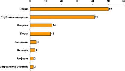 Несмотря на то, что существует достаточно широкий выбор различных видов макаронных изделий. Наиболее популярными среди населения видами макарон являются традиционные рожки и трубчатые макароны (50% и 41% соответственно). Также хорошим спросом пользуются «перья» и «ракушки» (см. рис. 2):
