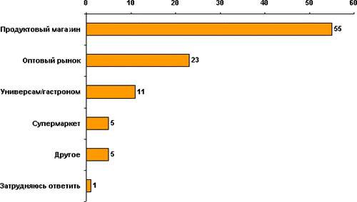 Самыми популярными местами покупки макаронных изделий являются продуктовый магазин, оптовый рынок и коммерческие павильоны (палатки). Люди старше 65 лет чаще, чем люди других возрастных категорий, покупают макаронные изделия в продуктовых магазинах. Женщины несколько чаще, чем мужчины (27% и 21% соответственно) покупают макаронные изделия в коммерческих палатках и павильонах. Чем ниже уровень дохода респондентов, тем чаще они покупают макаронные изделия в продуктовых магазинах, и наоборот, тем реже на оптовых рынках. На оптовых рынках, как правило, совершаются покупки большего, чем в продуктовых магазинах объема – от 1,6 до 2 кг макаронных изделий [27, c. 45] (см. рис. 4):
