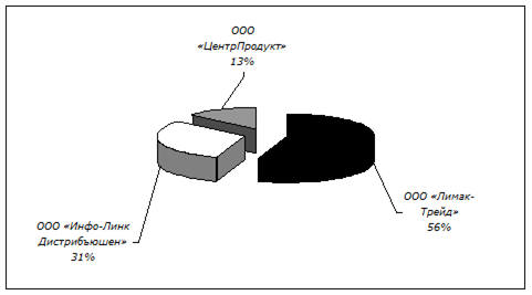 По сумме заключенных договоров первенство принадлежит компании ООО «Лимак-Трейд», ей принадлежит доля в 55,23% (58,35 тыс. рублей) от общего объема заключенных договоров.
