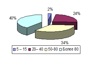 Проведем анализ структуры ассортимента чулочно-носочных изделий, предложенных к продаже в магазине «Соблазн» по уровню цен. Для этого можно условно разделить все модели по четырем ценовым категориям: от 10 до 70 рублей, от 70 до 150 рублей, от 150 до 300 рублей и от 300 до 500 рублей. Эти данные отображаются в таблице 2.9. Графически, данные таблицы 2.9 представлены на рисунке 2.14.