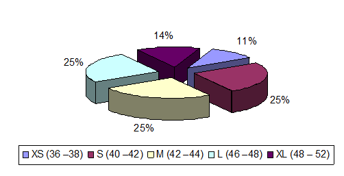 Из данных таблицы 2.8 видно, что максимальную долю в объеме предложения женских колготок занимают модели среднего размера: М (middle) – средний (42 – 44) – 1715 пар (25,3%), S (small) – маленький (40 – 42) – 1710 пар (25,22%) и L (1arge) – большой (46 – 48) – 1680 пар (24,78%). Такая структура предложения ассортимента достаточно обоснована, так как большинство потребителей укладываются в эти рамки.