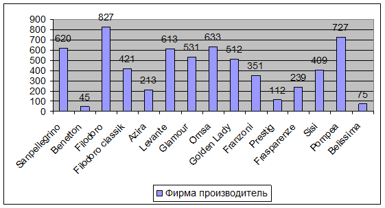 Уровень реализации для продукции различных зарубежных фирм не одинаков. Максимальный уровень реализации (99,84%) занимает фирма Omsa. Объясняется это широкой известностью этой марки и высоким качеством предлагаемых изделий. Немного отстает от нее по уровню реализации итальянская фирма GoldenLady (99,80%). На третьем месте по уровню реализации фирма Filodoro. Уровень реализации ее продукции составляет 98,55%. Минимальный уровень реализации среди зарубежных предприятий-изготовителей у таких фирм как Frasparenze (86,61%), Azira (85,91%) и Belissima (85,33%).