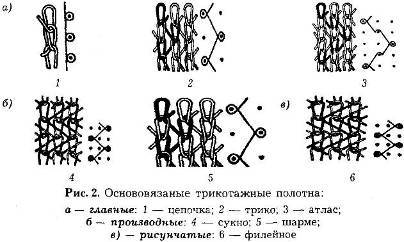 Трикотаж делят на основовязальный и кулирный. В основовязальном каждая нить образует в петельном ряду по одной петле и переходит в следующий ряд. В кулирном трикотаже каждая нить последовательно образует петли одного петельного ряда. Для образования одного петельного ряда кулирного трикотажа достаточно одной нити.