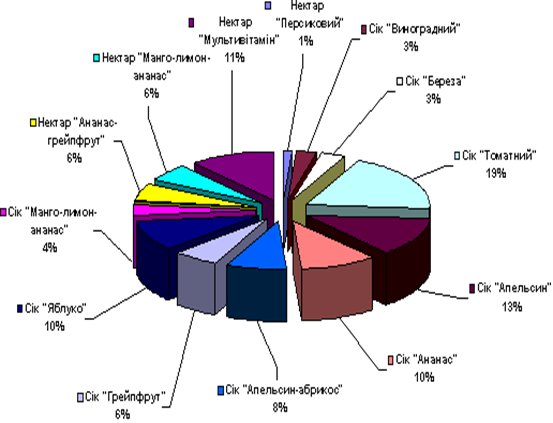 На 2008 рік асортимент ТМ «Смак» налічує 4 найменувань нектарів, і 9 найменувань соків (рис. 1.1.). Такі соки, як "Яблуко", "Апельсин" та "Ананас" і нектари "Ананас-грейпфрут", "Мультивітамін", "Персиковий" які розфасовують в упаковку по 0,2 л. і 1.л. Надалі підприємство планує запропонувати споживачам низку традиційних для України плодово-ягідних напоїв на основі згущеного яблучного соку. Найбільшу частку в загальному обсязі продажу займають томатний сік (19%), апельсиновий сік (13%), нектар "Мультивітамін" (11%) та по10% належить сокам "Яблуко" та "Ананас".