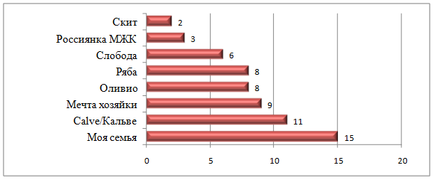 «Мечта хозяйки» пользуется спросом у 23% респондентов из Северо-Западного округа. Кроме того, этот брэнд предпочитают по 20% респондентов в Сибирском и Центральном, 16% – в Приволжском, 14% – в Уральском, 7% – в Дальневосточном и 1% – в Южном округе.