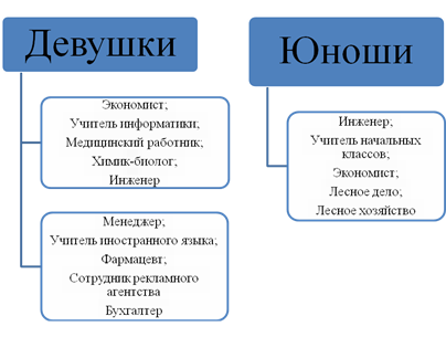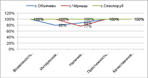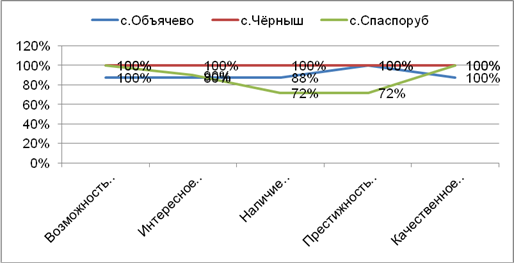 Глядя на результаты полученных диаграмм, можно судить о том, что основным критерием выбора специальности в среднем все опрошенные девушки считают возможность найти работу, интересное обучение, наличие бюджетных мест или невысокая стоимость обучения на коммерческой основе, престижность профессии и качественное обучение по этой специальности. Такого же мнения придерживаются и опрошенные юноши, исключением служат лишь два показателя: наличие бюджетных мест и престижность профессии, эти варианты для юношей спаспорубской СОШ не являются основным критерием выбора специальности.