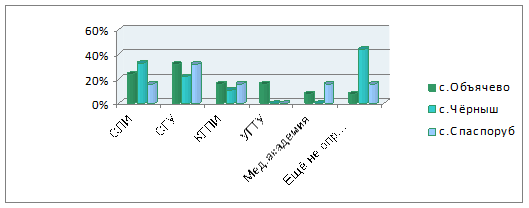 Исходя из данных таблицы, можно судить о том, что Сыктывкарский Лесной институт по многим показателям занимает лидирующее положение. Так юноши объячевской СОШ считают, что в СЛИ обучается больше студентов, тут же самые лучшие учебные корпуса, самые востребованные специальности, более профессиональные преподаватели, самый большой конкурс при поступлении и после его окончания выпускники легче находят работу. Девушки же считают, что больше студентов обучается в СГУ и там самый большой конкурс при поступлении. И одновременно они согласны с юношами, что в СЛИ самые востребованные специальности и после его окончания выпускники легче находят работу.