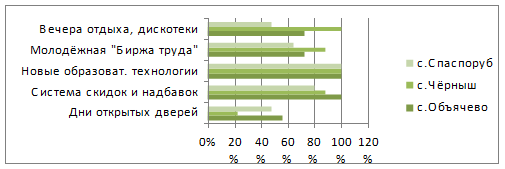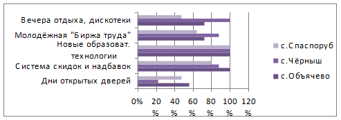 На основе составленных диаграмм, можно сделать вывод, что в среднем от 40 до 60% опрошенных девушек, и от 50 до 70% опрошенных юношей воспринимают СЛИ как вуз с широкой известностью, с высокой востребованностью выпускников, с высоким конкурсом при поступлении, с высоким качеством и с высокой стоимостью образовательных услуг. Лишь абитуриенты из чёрнышской СОШ не считают, что СЛИ, является вузом с высоким конкурсом при поступлении. Юноши этой же школы не воспринимают СЛИ как вуз с высокой стоимостью образовательных услуг.