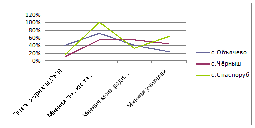 Исходя из данных диаграмм, можно увидеть, что на формирование мнения о СЛИ наибольшее влияние оказывают мнения тех, кто там учиться, так ответили от 50 до 100% опрошенных девушек. Предпочтение газетам, журналам и телевидению отдали лишь 15 - 40% опрошенных девушек. Немало важным фактором является то, что потенциальные абитуриентки от 30 до 55% прислушиваются к мнению своих родителей и к мнению учителей. А вот мнения юношей очень сильно расходятся. Для 90% потенциальных абитуриентов из спаспорубской СОШ и всего лишь для 35% юношей из объячевской СОШ наибольшее влияние оказывают мнения, кто там учиться. А вот для опрошенных юношей из чернышской школы вообще неважно мнения, тех, кто там учится, мнения своих родителей и мнения учителей. Но всё же для 55% юношей из спаспорубской и объячевской СОШ важным фактором, который влияет на формирование мнения о СЛИ является мнение их родителей. А вот мнения учителей могут повлиять лишь на 20% юношей из объячевской СОШ, и на 65% потенциальных абитуриентов из спаспорубской СОШ. В среднем же, можно сказать, что для 45 - 55% всех опрошенных абитуриентов газеты, журналы и телевидение могут оказать наибольшее влияние на формирование мнения о СЛИ.