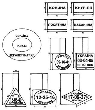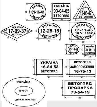 Крім зазначених основних форм клейм для маркування м’яса тварин різних видів встановлюються штампи прямокутної форми розміром 40х70 мм із написом "Ветогляд", у центрі позначається порядок використання "Проварка", "На варену ковбасу", "На м’ясні хліби", "На консерви", "На перетопку" (жир, шпиг), "Ящур", "Фіноз", "Туберкульоз", "Утиль" і номер підприємства.