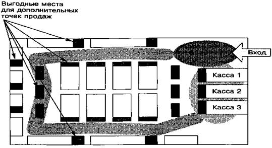 Дополнительные места продажи, как правило, организуются для самых продаваемых позиций товарной группы (для товаров с высоким оборотом) и товаров импульсного спроса. Дополнительные точки продажи располагают сообразно движению потока покупателей в торговом зале. Чаще их размещают при подходе к кассам, но эффективно действуют и дополнительные точки, расположенные по внешнему периметру торгового зала (в соответствии с правилом «перекрестного» мерчандайзинга), а также вначале торговых линий.