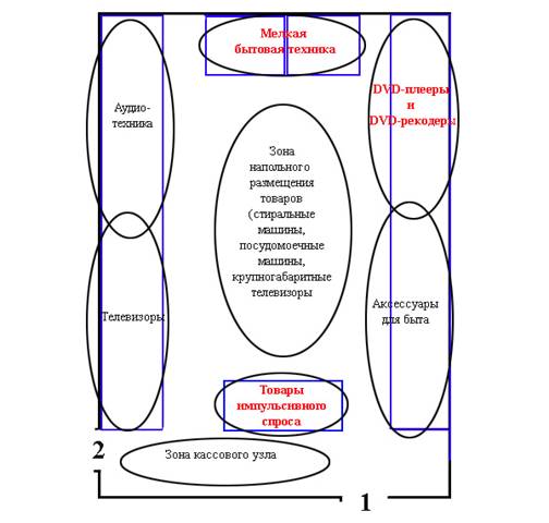 Мы считаем такое размещение товаров по ходу движения покупательского потока рациональным. Небольшие бытовые товары, приобретаемые по невысокой цене можно купить, не углубляясь в торговый зал магазина, практически рядом с кассовым узлом. Таким образом, покупатели, пришедшие за более серьезной покупкой, например, стиральной машиной и покупатели, «забежавшие» купить пару дисков, не мешают друг другу.