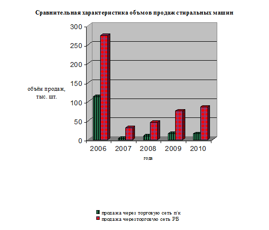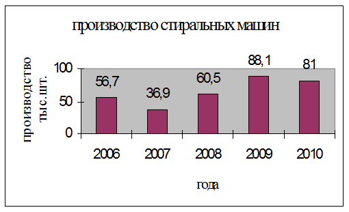 Исходя из данных таблицы 1.1, необходимо отметить, что производство в Республике Беларусь развивалось скачкообразно. Так, если провести расчет темпов роста можно отметить, что в 2010 году по сравнению с 2009 годом наблюдается спад, а по сравнению с остальными годами наоборот рост производства. Спад вызван тем, что в настоящее время происходит серьёзное проникновение зарубежных производителей стиральных машин на белорусский рынок, таких как Индезит, Электролюкс, Бош, Канди и других. Они предоставляют множество функций по сравнению не большим ценам, что качественно отличает их от отечественных марок. Также иностранные модели представлены широким ассортиментом автоматических машин. В тоже время необходимо отметить, что до 2009 года в республике была тенденция стабильного роста по отношению к прошлым годам. Это показывает, что государство оказывало сильнейшею поддержку отечественным производителям, в том, что сдерживало искусственно проникновение зарубежных производителей на наш рынок. Можно отметить, что население предпочитало по привычке покупать отечественные марки стиральных машин хорошо известных марок, а также сильнейшим фактором при производстве – отсутствие сырьевой базы, и при закупке комплектующих у иностранных партнеров за иностранную валюту, которой зачастую не хватает.
