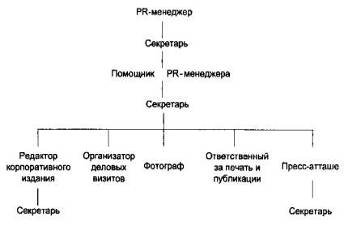 В зависимости от сочетания указанных факторов отдел паблик рилейшнз может состоять лишь из PR-менеджера и секретаря, но может иметь и большую численность и включать помощников менеджера, таких, как пресс-атташе, редактор внутрифирменного издания, дизайнер по печати, фотограф и т.д. Возможная структура PR-отдела большой компании показана на рисунке: