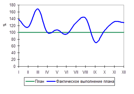 В 2002 году по выпуску оборудования для энергетики РУПДП "Зенит" работал неритмично. Коэффициент ритмичности равен 0,94, что меньше 1. В IV квартале план по выпуску продукции перевыполнен, а в I, II и III кварталах он недовыполнен. В 2002 году по выпуску электротехнического оборудования для лифтов РУПДП "Зенит" работал неритмично. Коэффициент ритмичности равен 0,93, что меньше 1. Во II и III кварталах план по выпуску продукции перевыполнен, а в I и IV кварталах он недовыполнен. В 2002 году по выпуску оборудования для электросвязи РУПДП "Зенит" работал неритмично. Коэффициент ритмичности равен 0,99, что меньше 1. В III квартале план по выпуску продукции перевыполнен, а в I, II и IV кварталах он недовыполнен. В 2002 году по выпуску товаров народного потребления РУПДП "Зенит" работал неритмично. Коэффициент ритмичности равен 0,96, что меньше 1. Во II и III кварталах план по выпуску продукции перевыполнен, а в I и IV кварталах он недовыполнен.