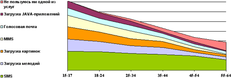 Исследование также выявило определенную зависимость - с увеличением возраста снижается доля пользователей дополнительных услуг мобильной связи. Возрастная группа 15-17 лет представляет собой самых активных пользователей. Среди этой группы нет ни одного респондента, который не пользовался бы ни одной из перечисленных услуг. Среди пользователей двух последних возрастных категорий SMS является крайне популярной услугой. Среди пользователей 45-54 лет sms пользуются 74,4 % опрошенных, а среди пользователей в возрасте 55-64 пересылкой коротких сообщений пользуются 54,4 %. Тогда как загрузкой мелодий в этих группах пользуется лишь 17,4 % и 13% соответственно.