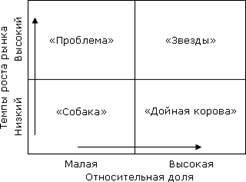 Для оценки конкурентоспособности отдельных видов бизнеса используются два критерия: темп роста отраслевого рынка; относительная доля рынка. Темпы роста отрасли 10% и более рассматриваются как высокие. Значение доли рынка, равное 1, отделяет продукты – рыночные лидеры – от последователей [9]. Таким образом, осуществляется деление видов бизнеса (отдельных продуктов) на четыре различные группы (рисунок 1.2):