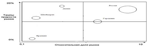 В наиболее выгодном среди сравниваемых рынков положении оказались рынки России и Германии, попадающие в поле "Звезды" (быстрый рост/высокая доля). Это рыночные лидеры. Они приносят значительную прибыль благодаря своей конкурентоспособности, но также нуждаются в финансировании для поддержания высокой доли динамичного рынка [10, с.224-227].