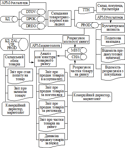 Як приклад розглянемо варіант отримання результатних даних для аналізу кон’юнктури товарного ринку підприємства на основі облікових даних про продаж товарів, наведених на рис. 3.2.3. За продажу товарів бухгалтерія (відділ збуту) виписує товаротранспортну накладну (ТТН). Більшість підприємств складає такий документ з використанням програмних засобів автоматизації бухгалтерського обліку (1С, Парус). При цьому формується файл продажу (PROD), який застосовується бухгалтерією для складання бухгалтерських документів і звітів (податкова накладна, відомість продажу готової продукції, відомість розрахунків з покупцем та ін.). На основі даних файла PROD за поточний місяць, нагромаджених (архівних) даних про продаж товарів за минулий час і результатів розрахунків місткості товарного ринку на АРМ маркетолога можуть бути складені звіти про продаж товарів в асортименті, по покупцях, по регіонах і країнах. При цьому обсяги продажу щодо зазначених об’єктів можуть бути розраховані з необхідним рівнем деталізації в кількісних і вартісних показниках, у процентному відношенні, графічно.