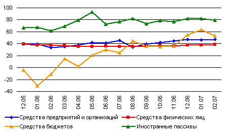 Подобная положительная динамика развития банковского сектора представляется достаточно закономерной: естественно, что по мере улучшения экономической ситуации все больше предприятий нуждается в качественном расчетном обслуживании, по мере роста благосостояния населения возникает все больше консервативных сбережений, хранящихся, как правило, на банковских депозитах. А по мере того, как у экономических субъектов укрепляется уверенность в будущем, растет потребность в кредитах. Реализацию подобных тенденций можно было наблюдать на практике несколько последних лет. Темпы роста основных привлеченных средств банков наглядно представлены на Диаграмме 1.