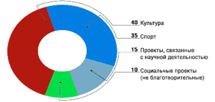 Еще один важный момент: в отличие от вложений в благотворительность, решения о которых чаще всего принимаются на собраниях акционеров или советом директоров и имеют долгосрочный характер, спонсорские проекты утверждают рекламные или маркетинговые управления финансово-кредитных организаций. И деньги при этом тратятся не из чистой прибыли, а из рекламного бюджета. Понятно, что при их распределении главное слово принадлежит подразделениям, отвечающим за формирование позитивного имиджа банка, и выбор того или иного проекта происходит исходя из соответствия его имиджевой стратегии банка в целом, а не только из экономической целесообразности.