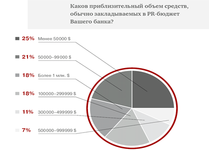 Очень важным для России аспектом развития банковского PR в современных условиях являются возможности его финансирования. Результаты исследования PRPartnerпоказали, что абсолютное большинство руководителей считает, что PR способствует закреплению за банком определенной репутации и улучшению финансовых результатов, а также увеличению доли рынка, т.е. это одна из сфер деятельности, на которой ни в коем случае не стоит экономить. Об этом свидетельствуют и результаты ответа на вопрос «Изменился ли бюджет, отведенный на PR в Вашем банке в 2007 году, по сравнению с прошлым годом?», которые показали, что в 73% случаев данный показатель увеличился. Кроме того, объем средств, закладываемый в PR-бюджет в некоторых банках, является сравнимым даже с американскими показателями: