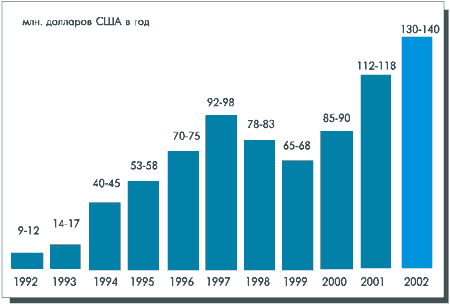 Рис.1.1.Объем затрат на рекламу в Санкт-Петербурге (1992-2002 гг.)