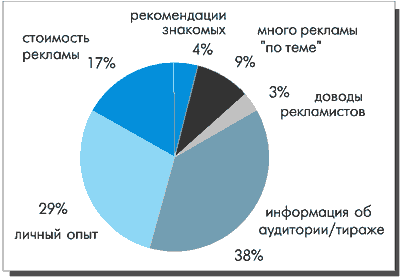 Выбор носителя определяют три ведущих фактора - «личный опыт», «стоимость рекламы» и «информация об аудитории/тираже».