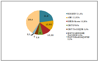| 5 | Основные торговые марки национального рынка | корпорация Roshen, компания «АВК», компания «КОНТИ», корпорация «Бисквит-шоколад», ОАО «Полтавакондитер», ЗАО «Львовская кондитерская фирма «Свиточ», ОАО «Крафт Фудз Украина», ЗАО «Житомирские ласощи», ЗАО «Одессакондитер», АОЗТ «Херсонская кондитерская фабрика», Днепропетровская фабрика «Малби» |