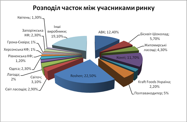Безпосередніми конкурентами ТМ "ROSHEN" є всі фірми, що виробляють аналогічну продукцію в Україні ("Світоч", "АВК", "Крафт Фудз Україна", "MILLENNIUM").
