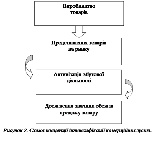 Багато компаній випливають концепції інтенсифікації комерційних зусиль. У її основі лежить вистава про те, що споживачі не будуть купувати товар, вироблений даної компанією, якщо не прийняти спеціальних заходів щодо просування товару на ринок і широкомасштабному продажу. Найчастіше ця концепція застосовується відносно так називаних товарів пасивного попиту – тих, про покупку яких покупець чи навряд замислюється (наприклад, енциклопедія або страховка). У цій ситуації сторона, що продає, повинна точно визначити коло потенційних покупців і роз'яснити їм переваги свого продукту [5].