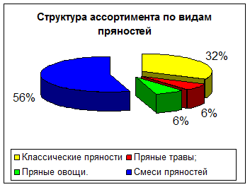 Наибольший удельный вес имеют смеси пряностей, предназначенных для приготовления определенного вида блюд. Они занимают 56% всего ассортимента пряностей магазина.