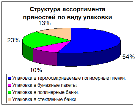 Наибольшую долю в структуре ассортимента (54%) занимают пряности, упакованные в термосвариваемую полимерную упаковку. На втором месте пряности, упакованные в полимерные банки, это импортные венгерские смеси пряностей, затем стеклянные банки (13%) и бумажная упаковка.