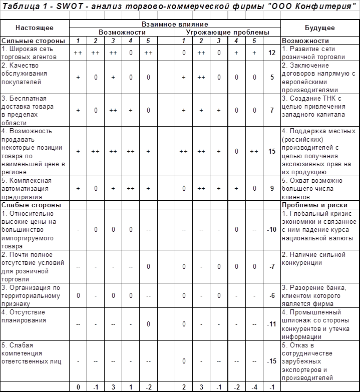 Далее в таблице 1 приведен SWOT – анализ торгово-коммерческой фирмы "ООО Конфитерия".