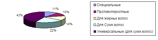 При покупке шампуней основным фактором, определяющим их выбор, является назначение: потребитель выбирает шампунь в зависимости от состояния кожи головы и волос. Оптимальным вариантом является тот, при котором структура ассортимента шампуней по их назначению соответствовала бы процентному соотношению типа волос потребителей. Расчет структуры ассортимента шампуней по назначению на основе обобщенных данных (рис. 2.3.) показал, что наибольшую долю в ассортименте занимают шампуни универсальные и для нормальных волос. Нами эти две группы объединены, так как практически это шампуни одного и того же назначения, хотя производители указывают его в маркировке по-разному. Почти в два раза меньшая доля представлена шампунями для сухих волос (22%). Шампуни для жирных волос и специальные (для окрашенных, для тонких и ломких волос, для придания объема, для блондинок и брюнеток и т.д.) представлены в пределах 10—14%. Анкеты, использовавшиеся при опросе, в приложении 1.