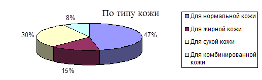 При изучении структуры ассортимента кремов по типу кожи было выявлено, что около половины ассортимента составляют кремы для нормальной кожи. Несколько меньшую долю составляют кремы для сухой (30%) и жирной (15%) кожи (рис. 2.5.). Анкеты по опросу в приложении 2.