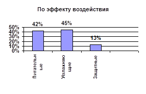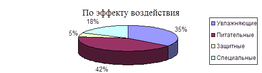 Ассортимент средств для ухода за кожей лица подразделяют также по эффекту действия на питательные, увлажняющие, защитные и специальные. Исследования показали (рис. 2.6.), что наибольшая доля в ассортименте (42%) приходится на питательные кремы, меньшая (35%) — на увлажняющие. Специальные средства (кремы для массажа, депилятории, отбеливающие, антицеллюлитные и т.д.) составляют 18%. К защитным кремам (их доля всего 5%) относятся солнцезащитные, средства после загара, защищающие от вредного воздействия щелочей, моющих средств и т.д. Последняя группа включает в себя и кремы для рук. Ожидается, что ассортимент защитных средств будет расширяться. Их употребление часто зависит от информированности потребителя, внимательного отношения людей к своему здоровью, от рекламы и других факторов, роль которых в настоящее время еще незначительна.