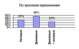 Исследования потребительских предпочтений по времени применения показали, что большая часть потребителей (46%) пользуются дневными кремами. Меньшую долю, как и в структуре ассортимента, составляют кремы ночные — 31%. Дневные и ночные кремы используют женщины старшего возраста. В результате анализа выявлено, что ассортимент по времени применения этой продукции потребителями и фактическая структура рынка полностью идентичны.