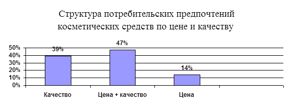 Наиболее важным в изучении любого рынка, в том числе и косметического, является исследование потребительских предпочтений в отношении качества и цены товара. Эти две характеристики находятся в постоянном взаимодействии, и цена часто определяется качеством. В то же время для косметических средств характерно увеличение цены за счет имиджа косметических фирм, которое может доходить до нескольких десятков раз. Долгое время сохранялось мнение, что спрос на товары на российском рынке, в том числе косметические, определяется их ценой вследствие низкой платежеспособности населения.