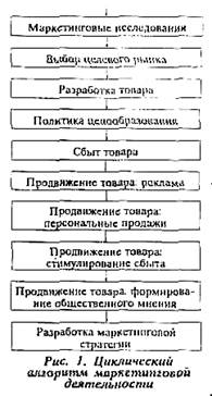 На приведенном рисунке раздел «Продвижение» разбит на четыре вида продвижения товаров: рекламу, персональные продажи, стимулирование сбыта и формирование общественного мнения — вследствие особой практической значимости и разработанности именно этого раздела маркетинга. Следует также отметить цикличность маркетинговой деятельности, так как при практическом применении каждый раздел маркетинга может информативно обогащаться от результатов предыдущих разделов и, в свою очередь, являться основой для развития следующих разделов.