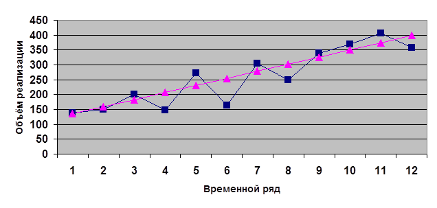 Анализируя построенные графики можно сделать сказать, что расчетные данные прогноза практически сохраняют ту же тенденцию развития, что и реальные данные об объемах реализации.