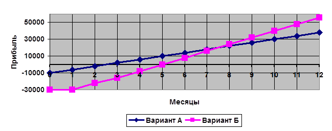 Анализ показывает, что вариант Б окупается за 2,5 месяца, вариант А за 5 месяцев. Далее вариант Б вообще предпочтительнее в течение 8,5 месяцев, но по окончании этого срока большую прибыль начинает приносить вариант А.