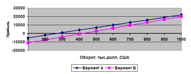 Анализ показывает, что вариант А возможен при оборотах, которые больше 250000 долл., вариант Б при оборотах, которые больше 420000 долл.