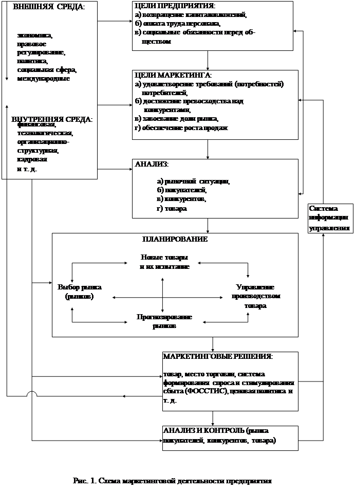 Маркетинг(от английского market - рынок) - комплексная система организации производства и сбыта продукции, ориентированная на удовлетворение потребностей конкретных потребителей и получение прибыли на основе исследование и прогнозирования рынка, изучения внутренней и внешней среды предприятия-экспортера, разработки стратегии и тактики поведения на рынке с помощью маркетинговых программ. В этих программах заложены мероприятия по улучшению товара и его ассортимента, изучению покупателей, конкурентов и конкуренции, по обеспечению ценовой политики, формированию спроса, стимулированию сбыта и рекламе, оптимизации каналов товародвижения и организации сбыта, организации технического сервиса и расширения ассортимента представляемых сервисных услуг. Маркетинг как порождение рыночной экономики является в определенном смысле философией производства, полностью (от научно-исследовательских и проектно-конструкторских работ до сбыта и сервиса) подчиненной условиям и требованиям рынка, находящимся в постоянном динамическом развитии под воздействием широкого спектра экономических, политических, научно-технических и социальных факторов. Предприятия-производители и экспортеры рассматривают маркетинг как средство для достижения целей, фиксированных на данный период по каждому конкретному рынку и его сегментам, с наивысшей экономической эффективностью. Однако это становится реальным тогда, когда производитель располагает возможностью систематически корректировать свои научно-технические, производственные и сбытовые планы в соответствии с изменениями рыночной конъюнктуры, маневрировать собственными материальными и интеллектуальными ресурсами, чтобы обеспечить необходимую гибкость в решении стратегических и тактических задач, исходя из результатов маркетинговых исследований. При этих условиях маркетинг становится фундаментом для долгосрочного и оперативного планирования производственно-коммерческой деятельности предприятия, составления экспортных программ производства, организации научно-технической, технологической, инвестиционной и производственно-сбытовой работы коллектива предприятия, а управление маркетингом - важнейшим элементом системы управления предприятием.