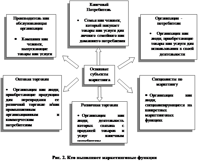 Субъекты маркетинга включают производителей и организации обслуживания, оптовые и розничные торговые организации, специалистов по маркетингу и различных потребителей. Как показано на рисунке 2, у каждого из них своя роль. Важно отметить, что хотя ответственность за выполнение маркетинговых функций может делегироваться и распределяться различными способами, совсем ими в большинстве случаев пренебречь нельзя, они должны обязательно кем-то выполняться.