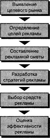 Компании разрабатывают планы рекламы с целью информировать потребителей о достоинствах товара и побудить их к покупке. Процесс планирования представлен на рис. 1. Рекламодатель (источник сообщения) определяет целевой рынок для проведения рекламной кампании, цели рекламы для воздействия на целевой рынок и разрабатывает рекламный бюджет. Затем рекламное агентство формулирует стратегию рекламы, т. е. кодирует ряд сообщений о достоинствах товара, и выбирает средства рекламы для передачи сообщения целевой группе потребителей. Далее рекламодатель оценивает эффективность рекламной кампании с учетом того, как потребители истолковали (декодировали) сообщение и отреагировали на него.