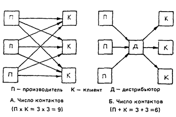 На рис. 1 представлен один из основных источников экономии, обеспечиваемой благодаря использованию посредников. В части «А» показано, как три производителя пытаются достичь трех клиентов методами прямого маркетинга. Этот вариант требует установления девяти отдельных контактов. В части «Б» показана работа также трех производителей через одного дистрибьютора, который устанавливает контакты со всеми тремя клиентами. При такой системе требуется установить только шесть контактов. Вот так посредники помогают сократить объем работы, которую необходимо выполнить.